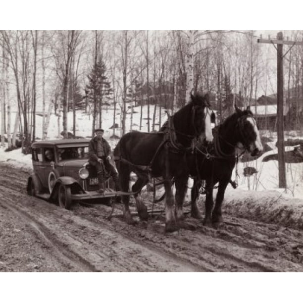 Two horses towing a vintage car Poster Print (24 x 36)